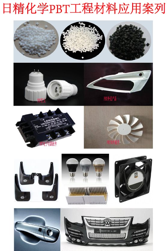 日精化学工程 PBT材料具有优良韧性和抗疲劳性,耐热、耐候性好,电性能佳,吸水率低,综合性能全面,应用广泛。对其进行增强、阻燃改性、可以显著提高其耐热性、模量、尺寸稳定性及阻燃性,广泛应用于汽车、电子电气等行业。